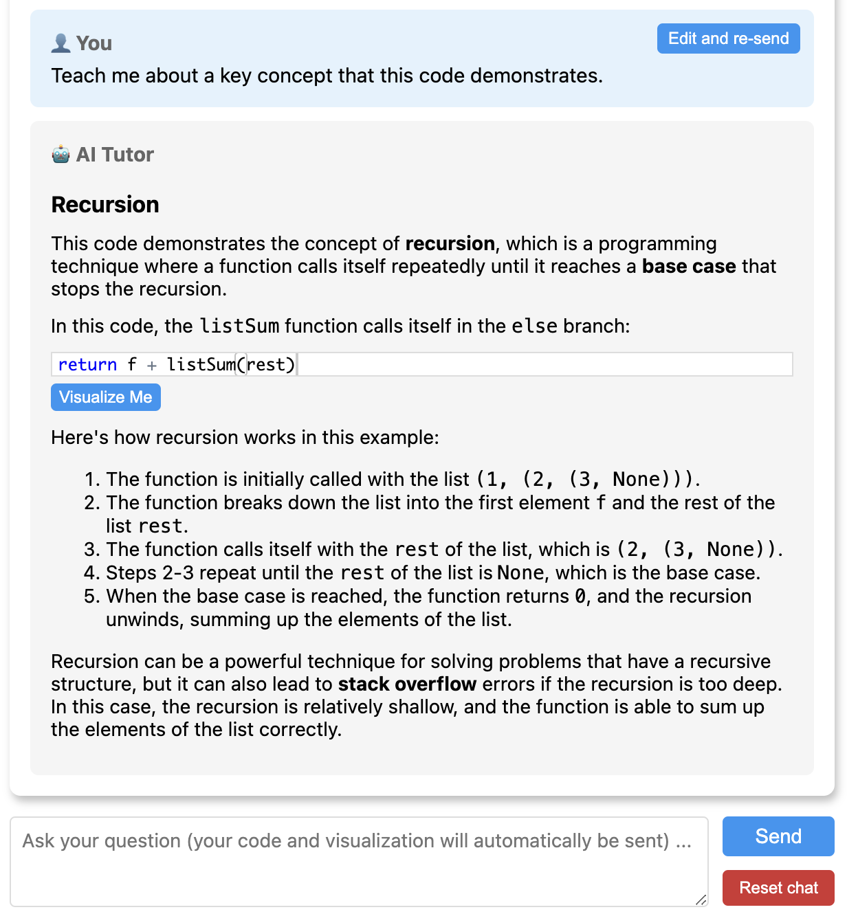 Online Compiler, AI Tutor, and Visual Debugger for Python, Java, C, C++, and JavaScriptPython Tutor helps you do programming homework assignments in Python, Java, C, C++, and JavaScript. It contains a step-by-step visual debugger and AI tutor to help you understand and debug code. Since 2010, over 20 million people in more than 180 countries have used Python Tutor to visualize over 300 million pieces of code. It is the most widely-used program visualization tool for CS education. As a preview, here is a small example that visualizes recursion in Python: You can also ask an AI tutor for help in understanding your code and visualization: